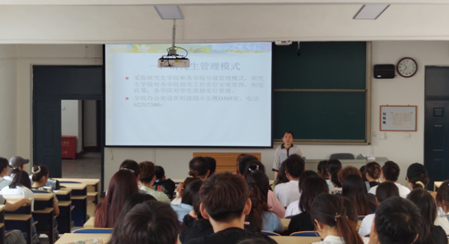 辅导员苏春华老师从研究生管理规定、奖助学金管理办法、勤工助学、评奖评优等几方面给新生同学进行了介绍,她鼓励学生要尽快转变角色、善于思考,勇于担当,尽早树立前进目标,用奋斗谱写人生新的篇章。